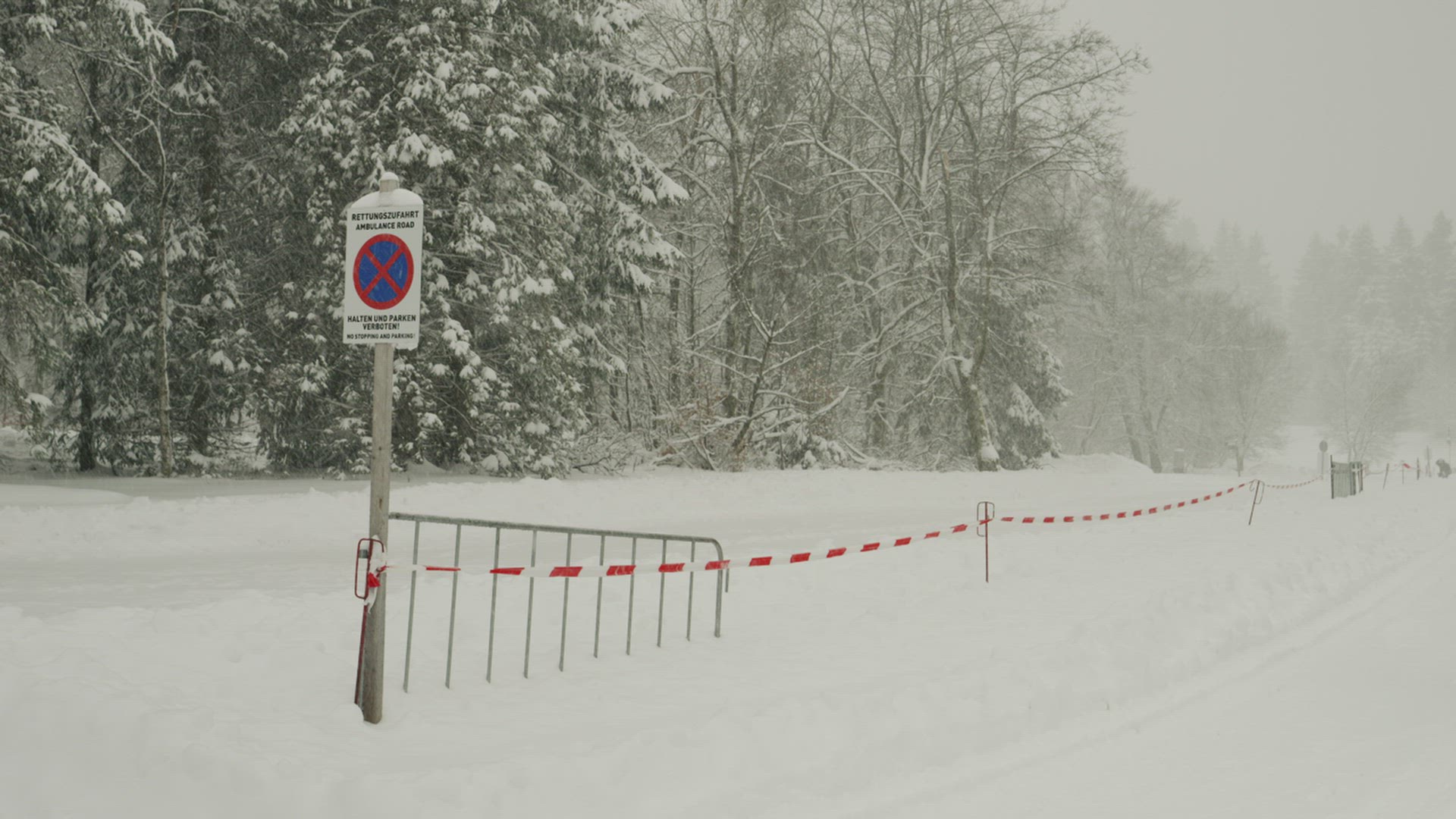 510680 - Yellow Fencing Tape is Fixed on the Fence Swaying Caution Signs Metal Rods Between Brick Pillars Par