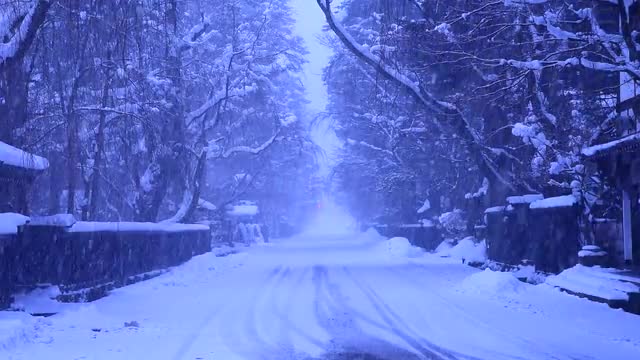 557510 - Old Wooden Church Table Covered With Snow Rustic House Winter Dry Leaves on an Oak Tree Wattle Fence