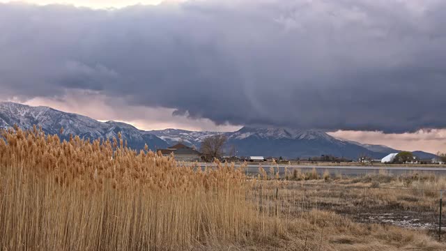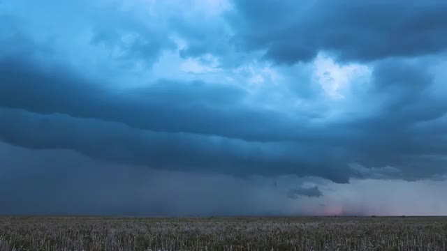 Lightning flashing through storm clouds moving over the landscape at sunset.