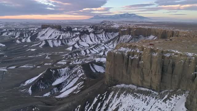 Panning aerial view of Skyline overlook in the Utah desert during winter with snow in the landscape looking towards the Henry Mountains.