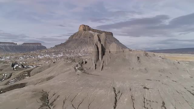 Flying over eroded desert terrain towards Factory Butte passing dirt spire in the vast Utah landscape.