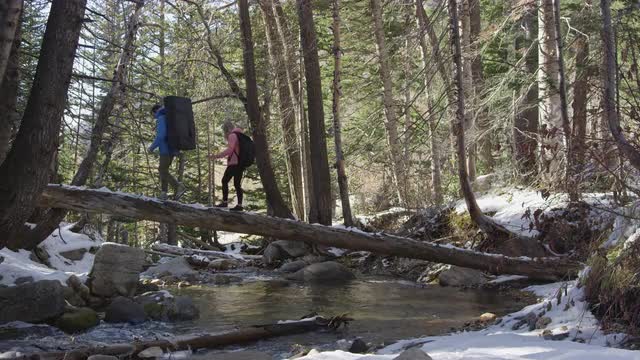 Woman balancing as she walks on snow covered log over a river with crash pad to go climbing.