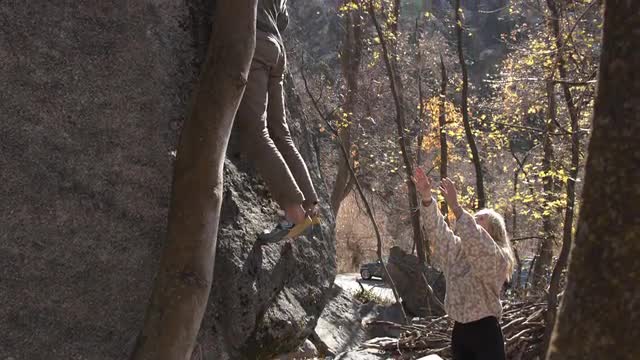 Woman spotting man as he climbs rock over crash pad tilting up towards the sun shining through the trees.