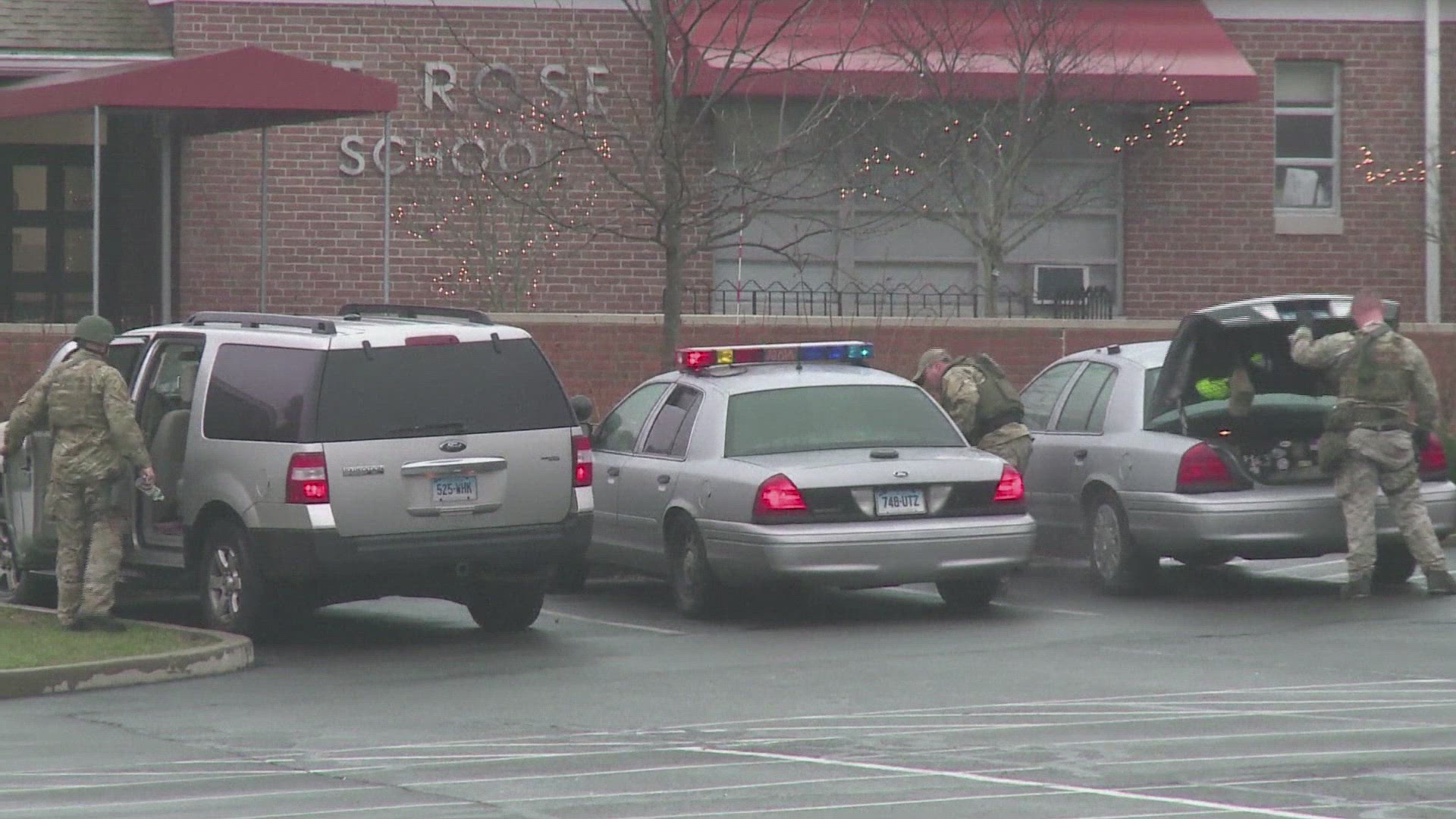 Circa October 2019, Highland Utah: Emergency vehicles out of focus with lights flashing and people walking during evacuation of high school.