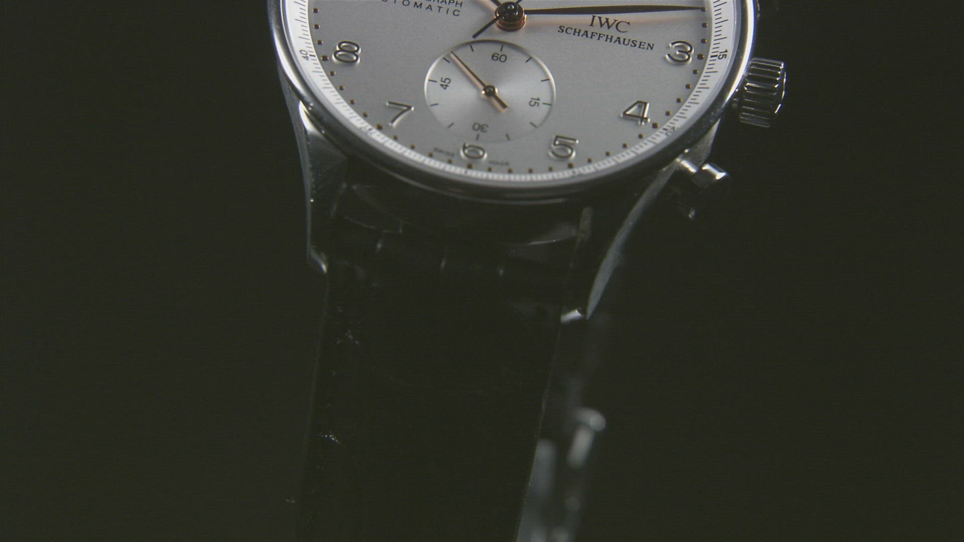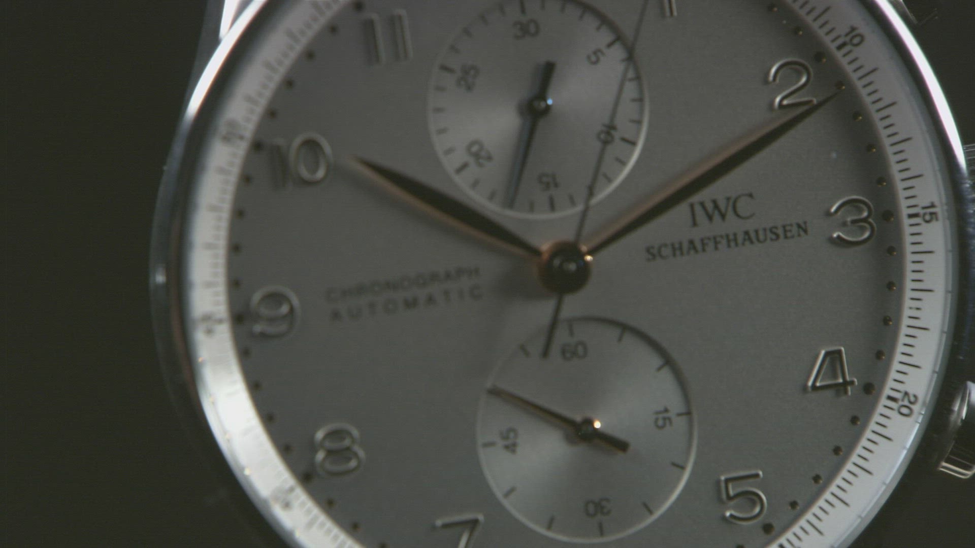 > Up close view of watch as second hand ticks past hour hand