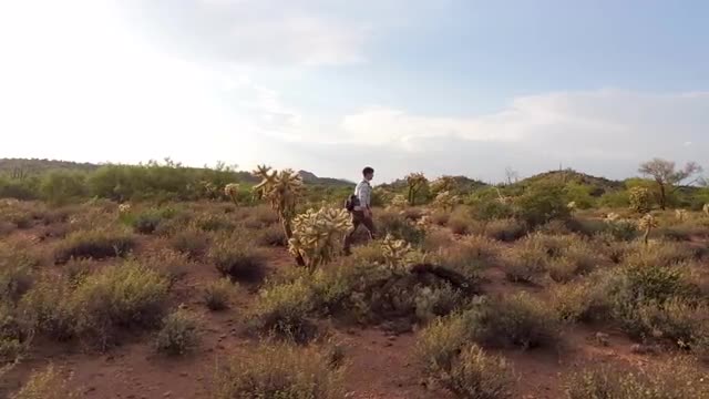 This video shows a close up view of the desert cacti while the camera is moving back and panning.