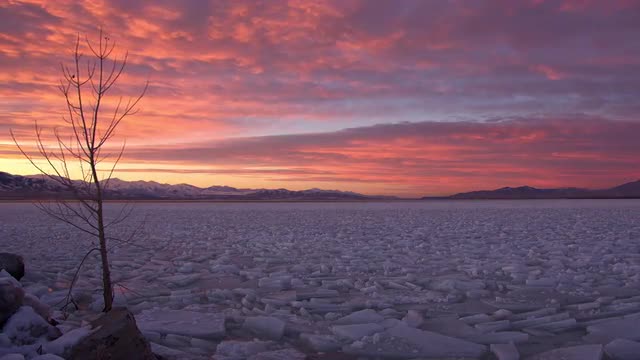 Broken ice fills lake during colorful sunset in Utah