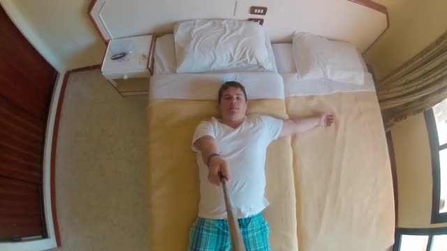 Caucasian business traveller climbing onto hotel bed
