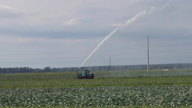 > Medium shot of irrigation lines swinging in a field