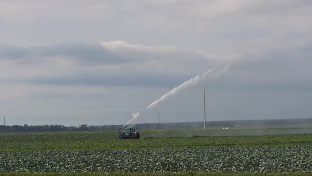 Medium shot of irrigation lines swinging in a field. Available in 8K.