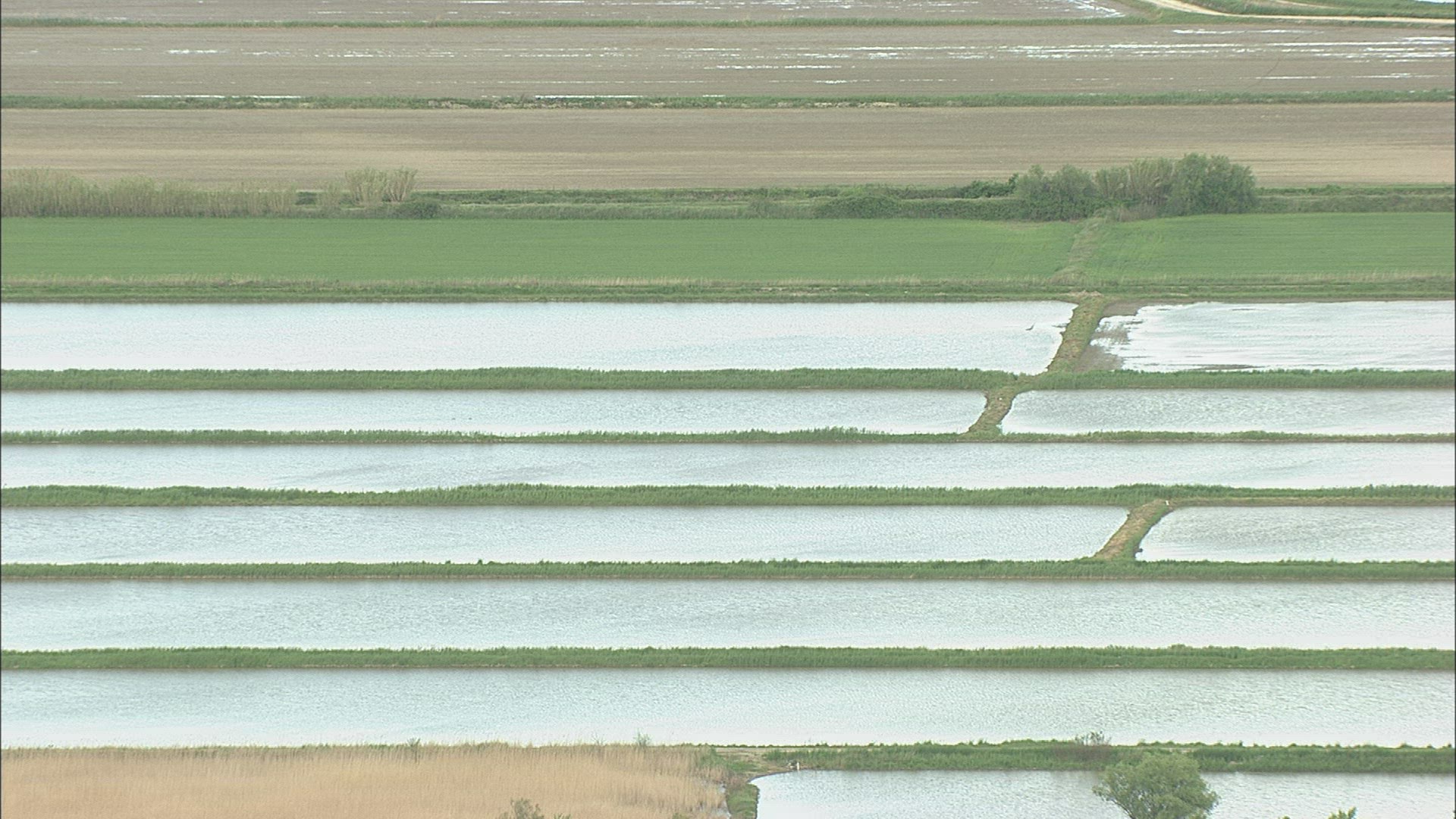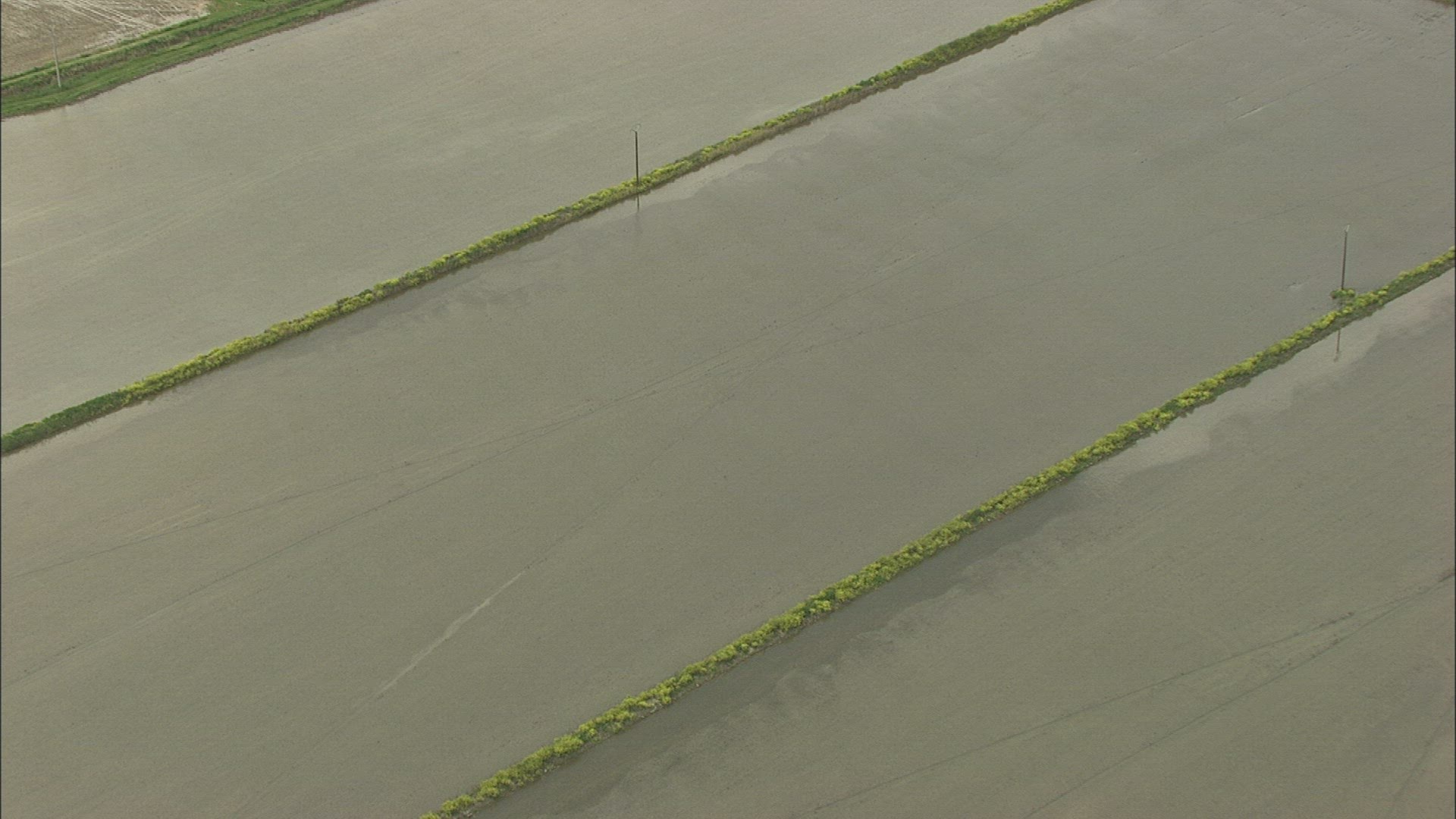 > Medium shot of irrigation lines swinging in a field