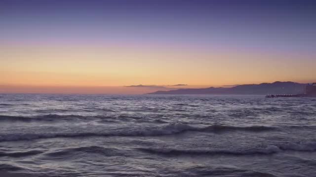 Sea waves at sunset and mountains in the distance