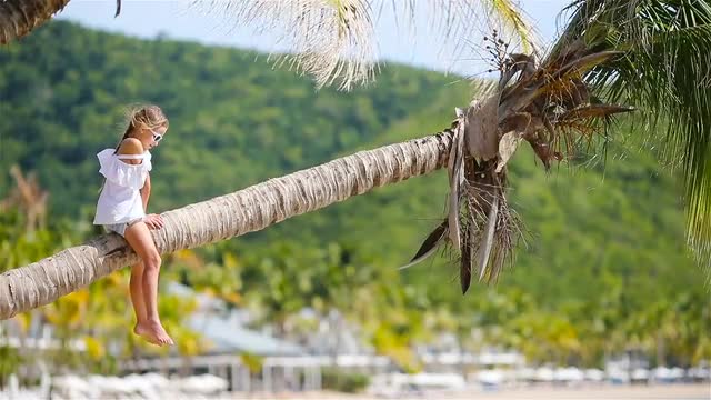 Adorable little girl at tropical beach sitting on palm tree during summer vacation