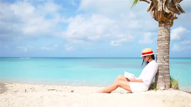 Young woman reading book on white beach sitting under the palmtree