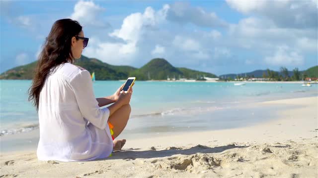 Young woman with smartphone during tropical beach vacation. Beautiful girl on the beach with cellpho