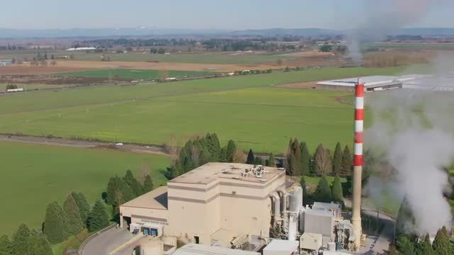 Factory warehouse with smoke and steam rising from smokestacks