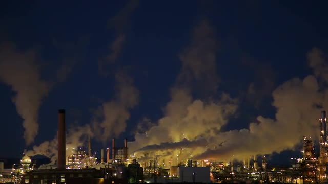 > Factory warehouse with smoke and steam rising from smokestacks