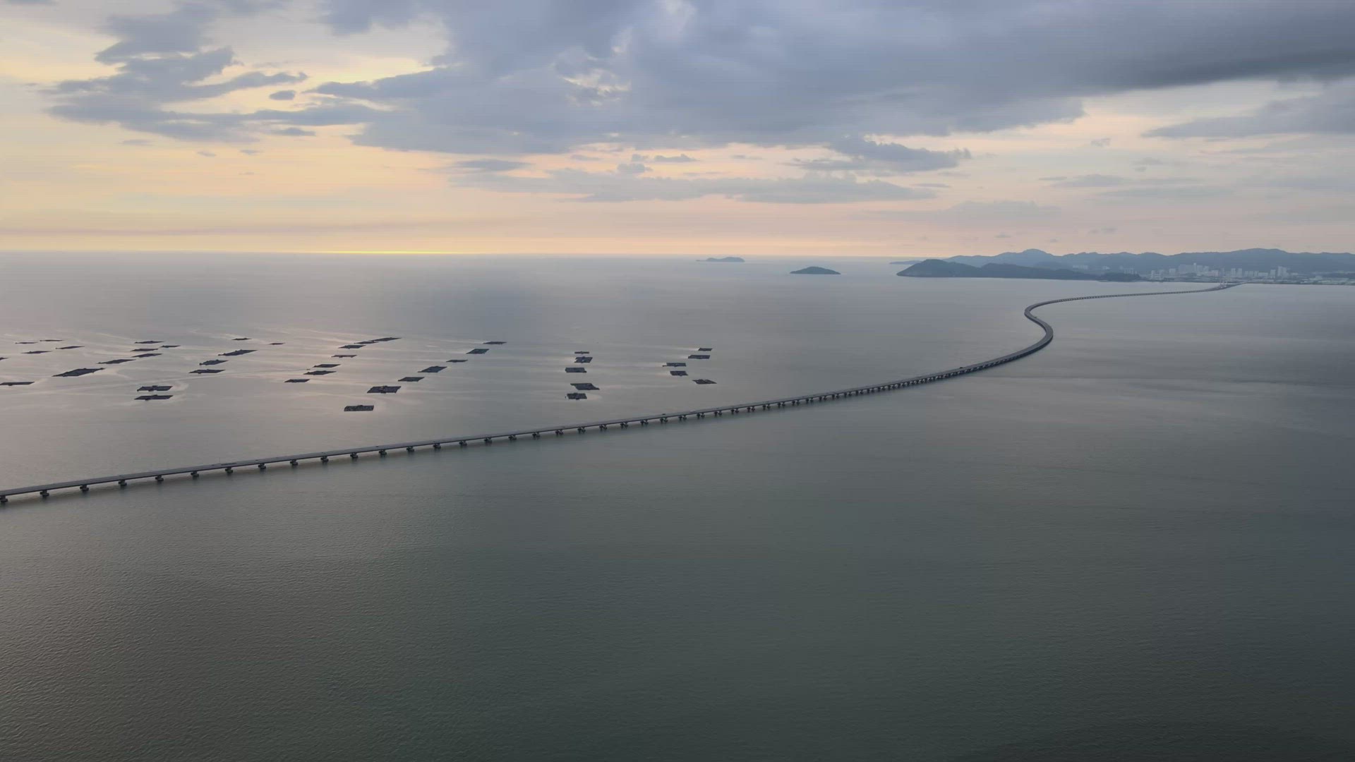 Aerial view with the ocean at sunset. salmon and mussel farms in the sea