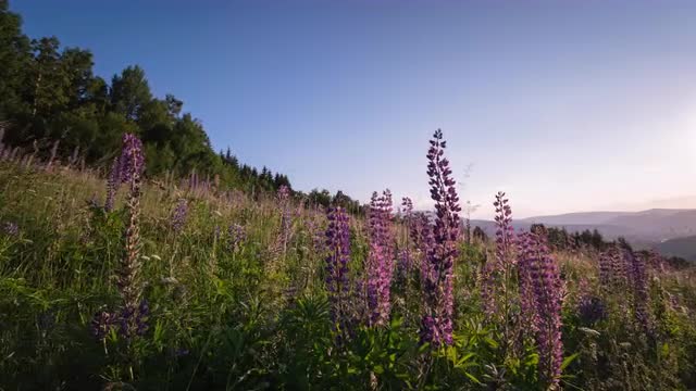 > Summer meadow with lupins and sunset colours 8K