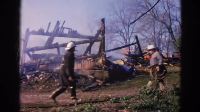 Firemen pulling hose inside burning house