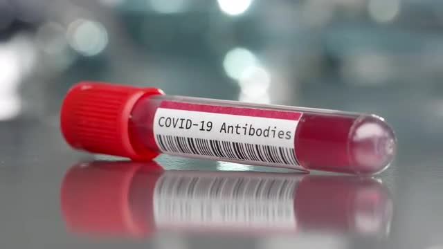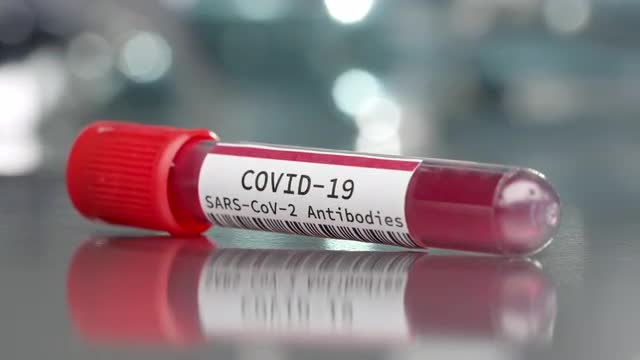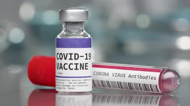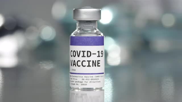 > Nurse holds up clear vial of medicine and examines it from various angles