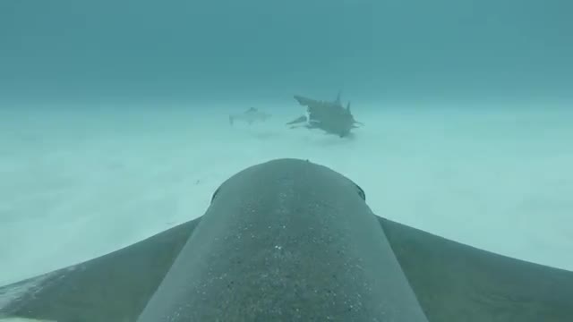 Camera follows shark as it swims with other sharks.