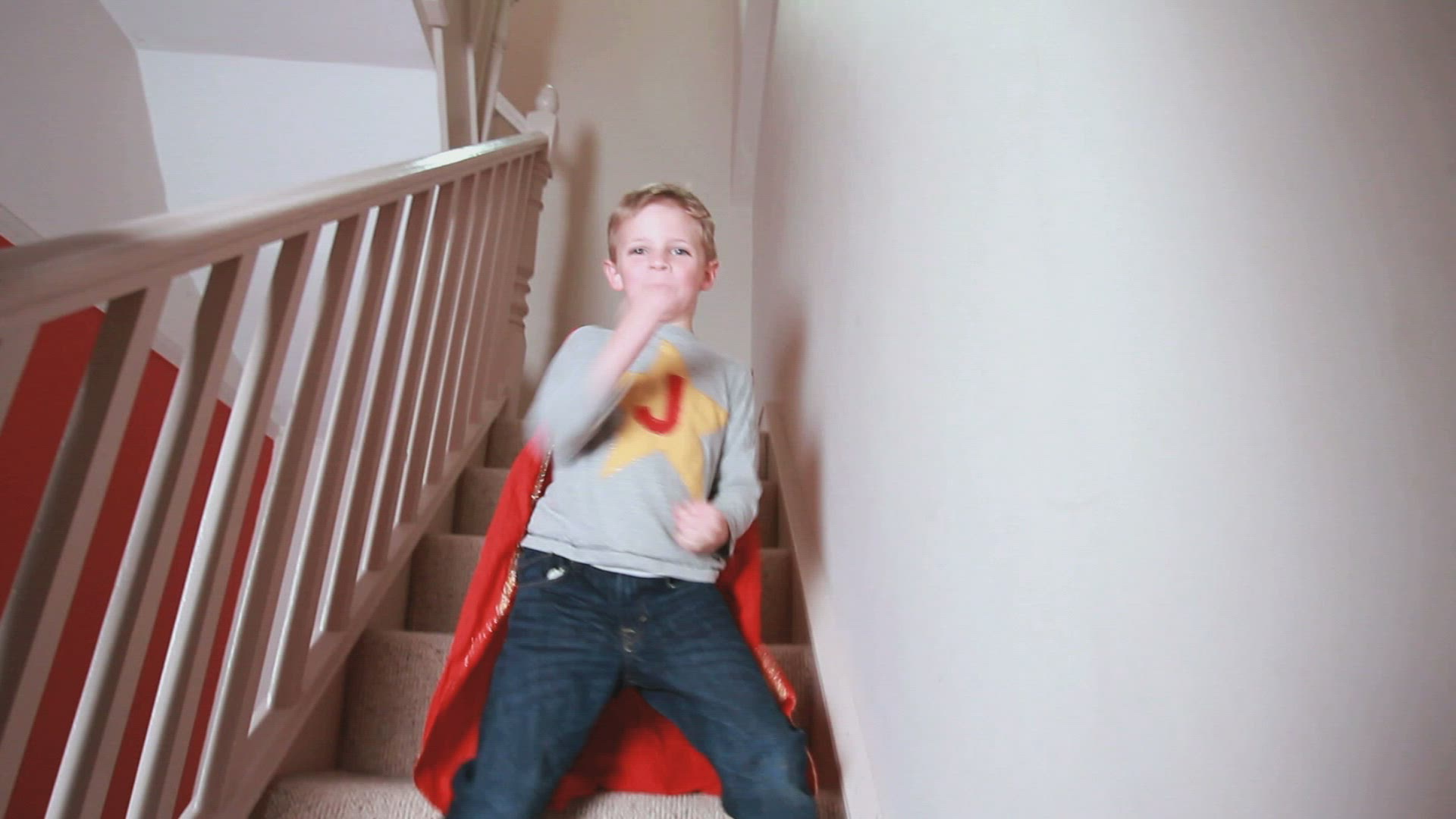 > Low angle of blonde boy joyfully running in the park with blue mask, black cape