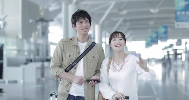 > Young attractive and happy Japanese couple at the airport