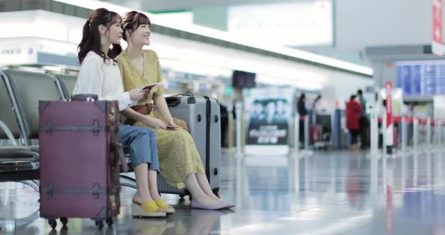 AdultAirportAsianBagBenchChairConversationExcitingExcitedFriendMateFriendly ChatFunGazingLooking awayGoing OutHoldingHolidayIndoorJapanJapaneseKansaiKinki RegionLeisureLuggageMuseum InteriorOsakaPassportPersonSitSlow MotionSmileSpeakingSuitcaseTerminalTravelTravelerTwo peopleTwoWomanYoungYoung personYouthcontains peopleyoung adultyoung women25-29 yearsAsian ethnicityJapanese ethnicitymid adultmid adult women30-34 years
