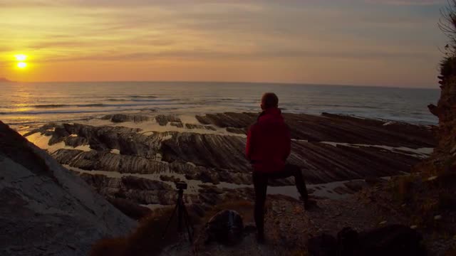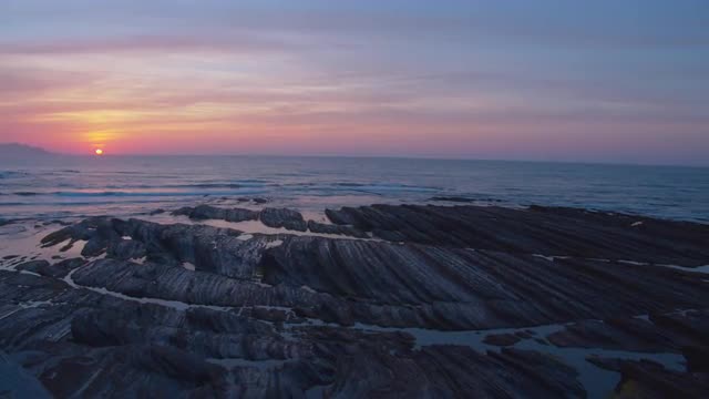 1101024 - Pan shot of the sea with rocky formation at dawn. Flysch