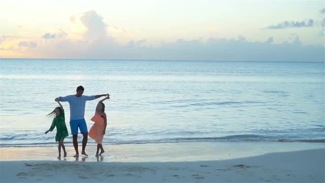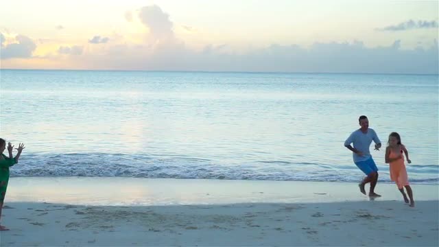 Family of four is playing in the sand close to the waves on the evening sea shore. All of them, mother, father, elder boy and his little sister are enthusiastically creating something from the wet sand. There is a beautiful evening seaview with misty rocks behind them