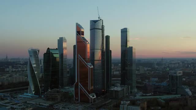 > An aerial view of skyscrapers in Moscow city district