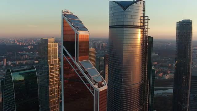 MOSCOW, RUSSIA- SEPTEMBER 25, 2019: Aerial cityscape at sunset. Moscow International Business Centre with modern glassy skyscrapers
