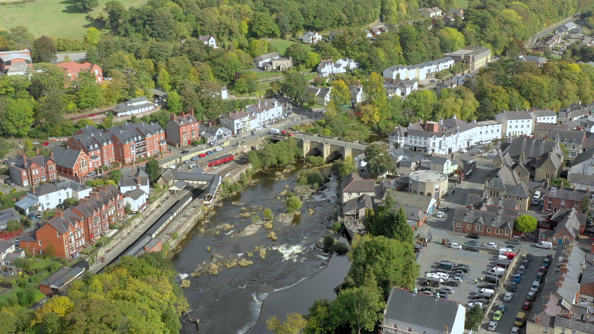 Aerial scene of Russian town with walkway, apartment blocks and green spaces