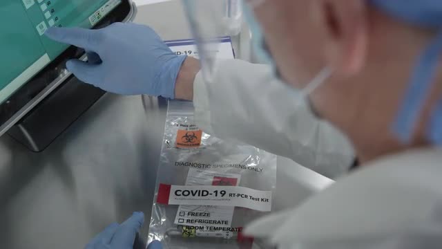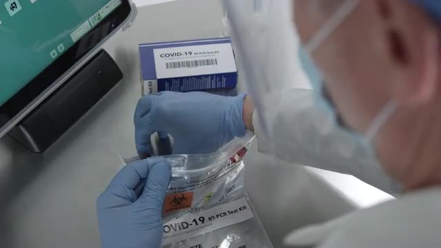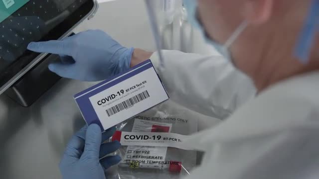 1101779 - Over the shoulder look of medical personnel working on covid-19 kit