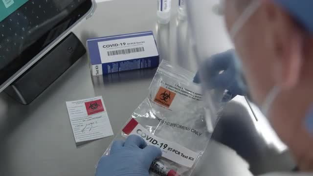 1101766 - Coronavirus swab test being sealed in vile and plastic bag