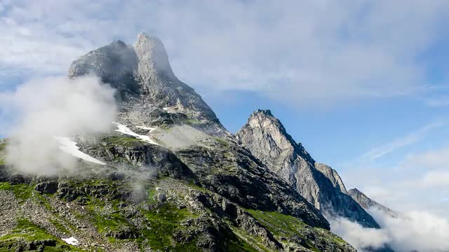 4K UHD Timelapse footage (200 frames) of clouds passing over and casting shadows on mountain peaks near Åndalsnes, Norway.