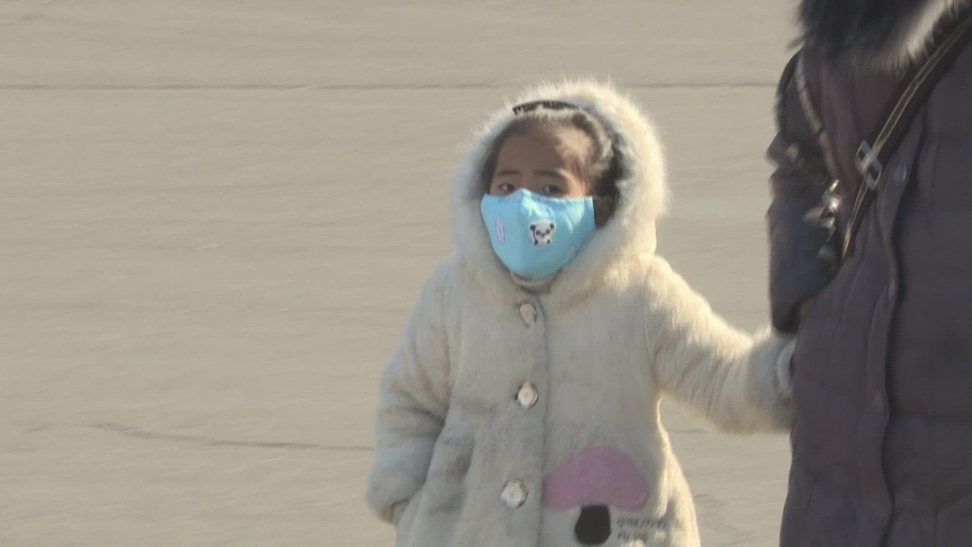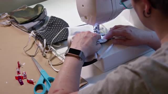 > Over the shoulder look at person sewing face masks