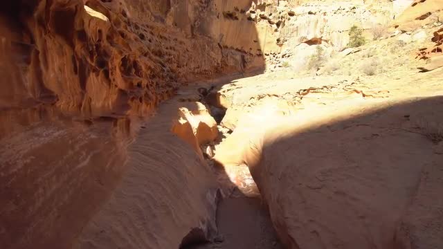 1106737 - Woman hiking through sand in slot canyon through trees