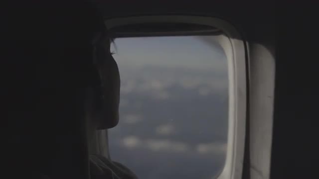 774843 - Woman staring out airplane window flying above clouds