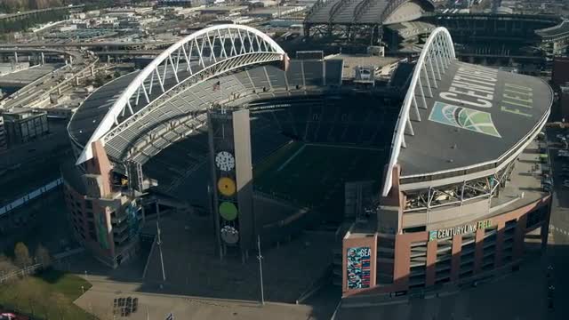 > Aerial trucking shot to reveal quiet Space Needle in downtown Seattle
