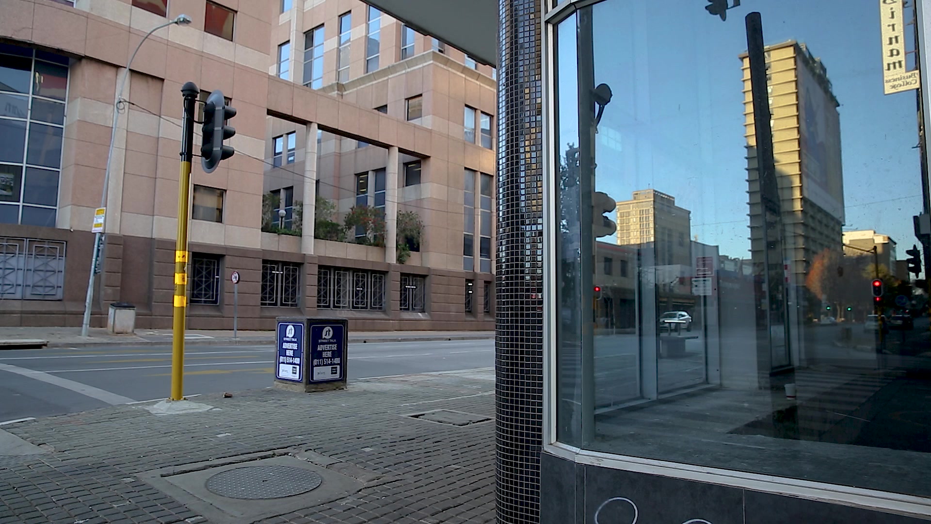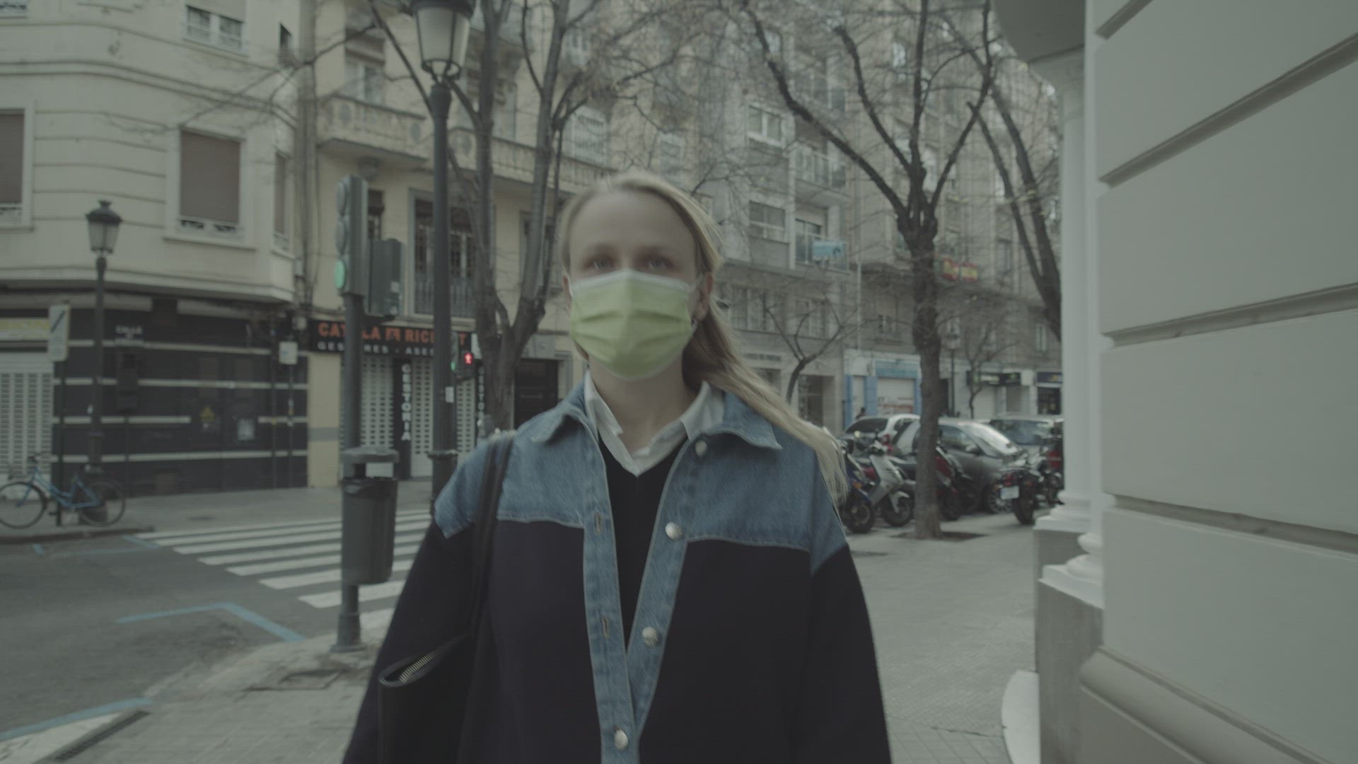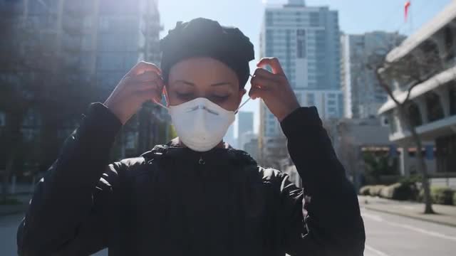 1103707 - Attractive Girl putting on medical mask standing downtown