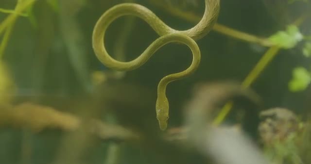 > Green snake hangin from tree