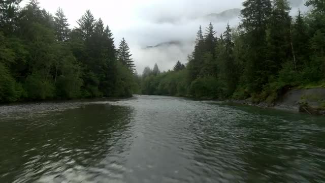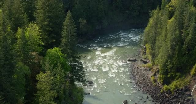 Aerial shot of Snoqualmie River in Washington. 6K CINEMADNGs AVAILABLE UPON REQUEST.
