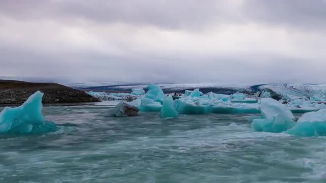 > Dolly across large chunks of ice at freezing Utah Lake in winter slow motion