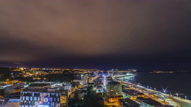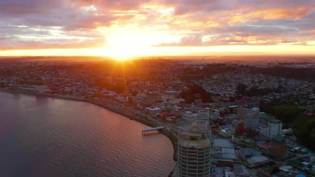 aerial view of the bay of the city of Puerto Montt with a beautiful sunset