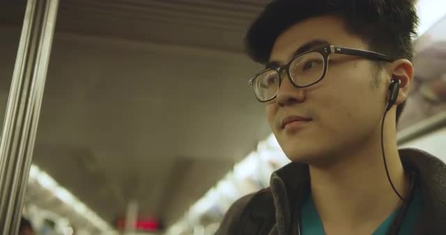 young nurse using smart phone on subway, shot pans up from backpack to model