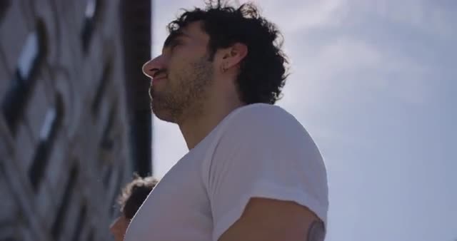 Medium shot from below of a young couple walking down the street together.