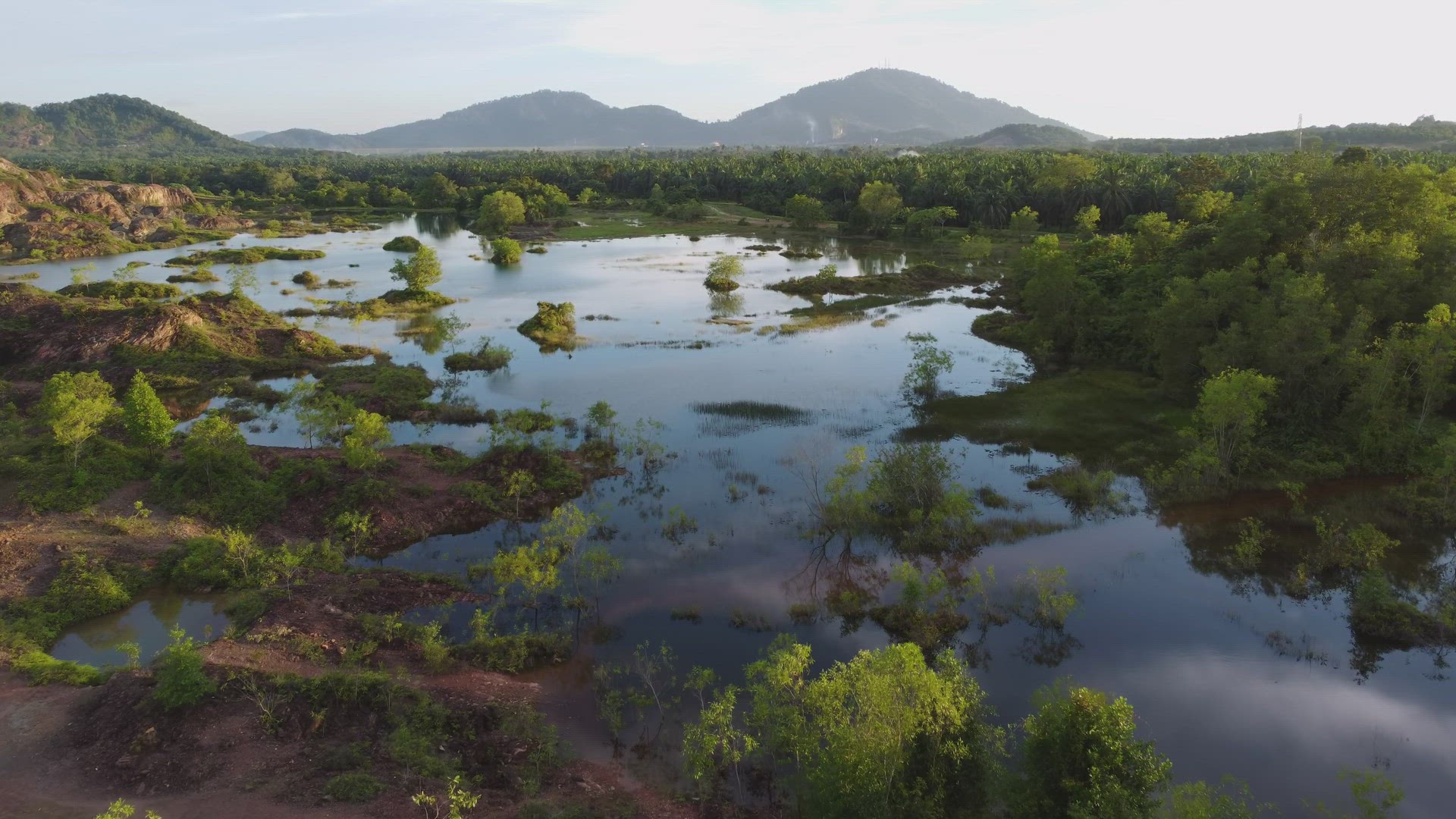 777381 - Aerial View - Palm Oil plantation at sunrise, top down view.