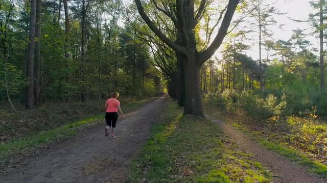 SLO MO AERIAL WS Woman jogging on treelined dirt road / Breda, Noord-Brabant, Netherlands